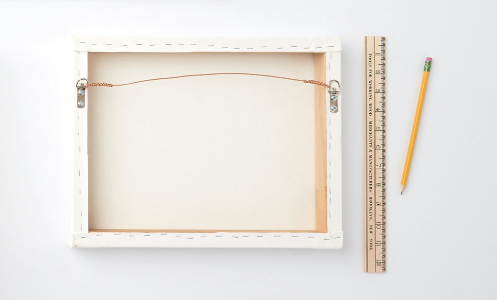 Then flip your piece over and assess the framing hardware on the back. Not all frames and canvases have the same hanging device, so to ensure all of the pieces are aligned, you’ll need to measure the distance between the hanging hardware and the top of the frame/canvas.