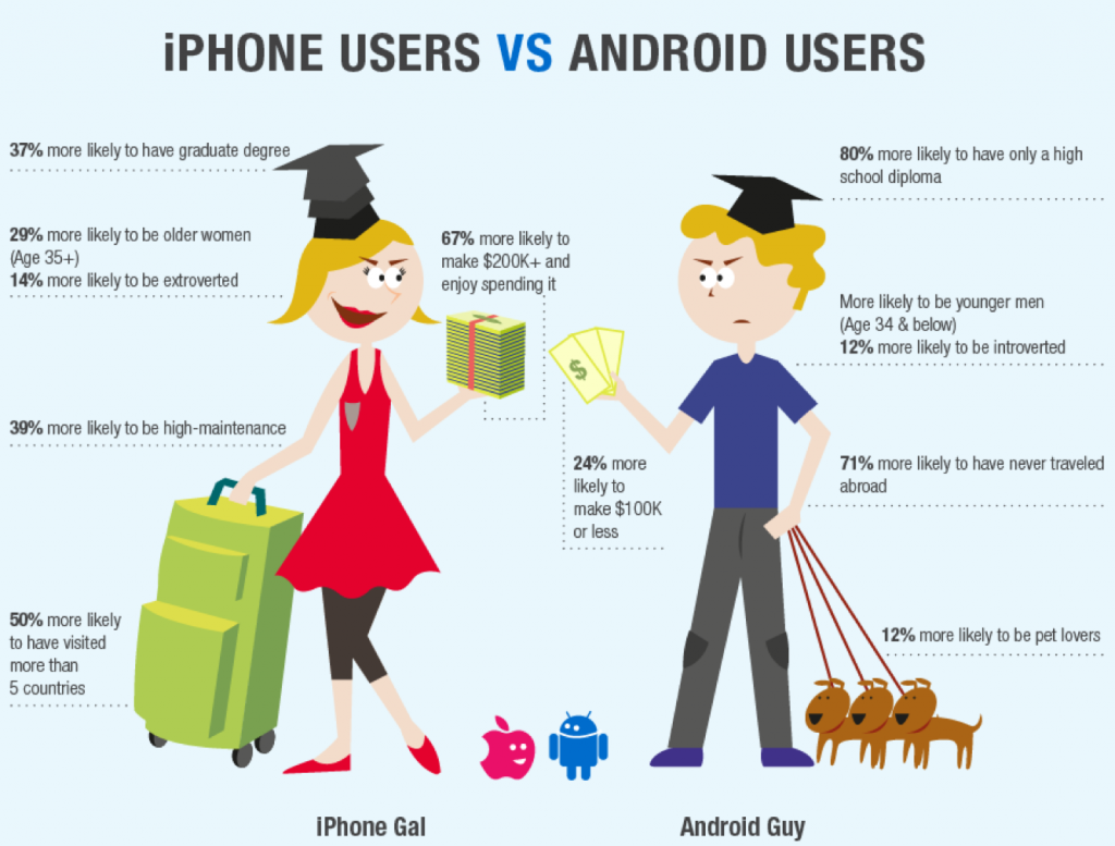 iPhone users are different than Android users. Check out this infographic made by Coffee Meets Bagel, a dating app, comparing iPhone users with Android users. Interesting, huh? Did I mention I love data?
