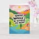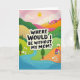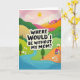 This design shows a stylized landscape that feels like an affectionate thank-you, with gentle curves and cozy details that suggest a close bond ❤️. In the center, a large creamy-white speech bubble carries the message “WHERE WOULD I BE WITHOUT MY MOM?” in thick black lettering, standing out clearly against the soft background. The bubble has a faint shadow that gives it a cutout look, making the words feel front-and-center. Rolling hills spread outward in layered bands of emerald green, sun-warmed orange, and blush pink, each band marked with subtle diagonal stripe texture. A light pink sky holds a few puffy white clouds and a simple yellow sun, adding a calm, caring glow 🌼. Near the bottom, an aquamarine river winds through the scene, bordered by tiny white blossoms and stylized trees with varied green canopies. Tucked into the hills sits a small deep-blue house with a bright red roof, and the river curves past it like a quiet path home. Above the hills, the pale sky frames the creamy text bubble, with white clouds drifting near the round yellow sun.