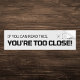 Make a bold statement on the road with this attention-grabbing bumper sticker. Featuring the humorous and direct message "IF YOU CAN READ THIS, YOU'RE TOO CLOSE!" in striking black text against a grey background, it's the perfect way to remind tailgaters to keep their distance. Ideal for any vehicle, this sticker combines a touch of humor with a serious reminder for safer driving.