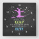 Tell the time with a "chalkboard" textured inspirational gymnastics wall clock -- sure to please any gymnast. It shows a gymnast mid-leap among a group of stars. The text reads, "If you never leap, You will never know what it's like to fly!".