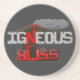 This drink coaster features the phrase "Igneous is Bliss," a geology spin on the common phrase "Ignorance is Bliss." The letters are drawn as grey rock and red, crystal-bearing magma mush below an active, erupting volcano.