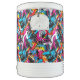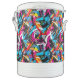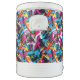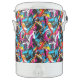 Igloo cooler is shown in the ten-gallon size with a colorful abstract print overall.