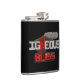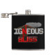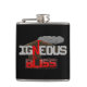 This geology humor hip flask features the pun "Igneous is Bliss," a geology spin on the common phrase "Ignorance is Bliss." The letters are drawn as grey rock and red, crystal-bearing magma mush below an active, erupting volcano.