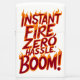 A poster featuring bold typography that reads instant fire, zero has been boom. The words are arranged in a dynamic and explosive manner, capturing the essence of sudden ignition and zero noise.