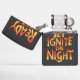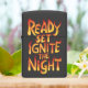 A digital illustration of the phrase Ready, Set, Ignite the Night written in a stylized font resembling fire. The image is brightly colored and vibrant.