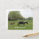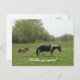 Cute image of a tiny paint foal following the black and white horse across a green pasture, with the words beneath, "I'll follow you anywhere!"
