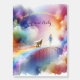 Watercolor illustration I'll meet you at the Rainbow Bridge. A whimsical, dreamlike scene depicting a colorful, ethereal Rainbow Bridge stretching across a fantastical landscape filled with soft, swirling clouds in vibrant hues of blue, pink, and yellow. The atmosphere is serene and magical, evoking a sense of wonder and tranquility, surrounded by shimmering stars and light trails that enhance the enchanting feel of the scene.