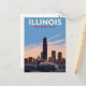 Showcase the heart of the Midwest with this stunning, vintage-style travel postcard for Illinois! This design features a dramatic, stylized Chicago skyline at sunset or twilight, with towering skyscrapers casting their silhouettes against a vibrant sky of blue, orange, and pink. It perfectly represents the Prairie State's dynamic urban center. With the bold, retro text "ILLINOIS PRAIRIE STATE," this art piece is ideal for Chicago natives, architecture enthusiasts, urban travelers, and anyone who loves classic American travel posters. Send a piece of the Windy City or frame it as a modern piece of wall art!
