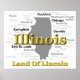 Illinois state pride image including map silhouette with cities, towns and nickname.