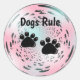 A fun saying 'dogs rule' accented by an illuminated pink background with loads of little black paw prints. Two big paw prints accent it. Customize as desired.