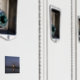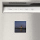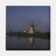 Souvenir photo magnet with illuminated historic windmills with reflection in the water of the river during the Blue Hour at the beginning of the night in Kinderdijk in the Netherlands.