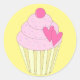 A Delicious cupcake with strawberry icing and rainbow sprinkles on top. Decorated with sugar love hearts and a candy ball. Yellow background.