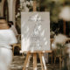 The sign features an off white background, offering a serene and classic canvas that enhances the minimalist design. The elegant charcoal gray font, inspired by vintage calligraphy, adds a touch of sophistication and warmth. This carefully selected typography complements the artistic elements, ensuring your wedding details are presented with style and clarity.