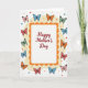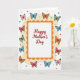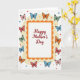 This greeting card features the words “Happy Mother’s Day” centered on a white background, surrounded by an ornate double border that feels like a gentle embrace ❤️. The lettering is a warm reddish tone and sits neatly in the middle, drawing your eye before you notice the details around it. A scalloped outer frame in rich orange wraps around the message, with a fine dotted line just inside it for extra texture. The border shifts inward to a creamy yellow layer, softening the look and giving the center space to breathe. All around the frame, stylized butterflies drift across the creamy yellow area, their black-outlined wings colored in pinks, reds, blues, greens, and oranges, as if they’re circling the greeting together 🌼. Their scattered positions and varied sizes create the sense of friendly motion, like a group arriving to celebrate someone dear. Small confetti-like dots in mixed colors and sizes are sprinkled across the background, adding a light, festive sparkle. The orange scalloped edge stands out most along the top and sides, while the butterflies cluster more densely near the corners.