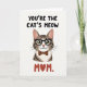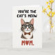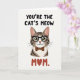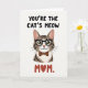 This card features an upright, human-like tabby cat shown from the chest up on a bright white background, with warm brown-and-cream stripes and fine whiskers that give it a gentle, friendly presence. The cat’s yellow eyes look forward through thick, dark glasses, adding a thoughtful, affectionate tone as if it’s sharing a private joke with someone it adores ❤️. A spotted bow tie sits neatly under its chin, with a pattern that echoes wild-cat markings for a cute, dressed-up touch. Across the upper third, large uppercase text reads “YOU’RE THE CAT’S MEOW” in dark lettering that stands out sharply against the white space. Beneath that, the word “MOM.” appears in bold letters, with a red heart used in place of the “O” 🌼. The layout leaves lots of open space around the character and words, so the cat and message feel close and focused, like a warm glance across a room. The heart is a bright red shape centered within “MOM.”, and the cat’s bow tie shows small contrasting spots against its base color.