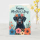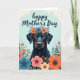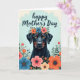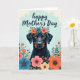 The front design shows a dark-coated dog shown from the head and shoulders, looking straight out with warm amber eyes that feel gently attentive, like it’s sharing a quiet moment with someone it trusts ❤️. Subtle warm brown accents highlight the muzzle and brows, adding softness to its expression. A flower crown rests across its head, mixing coral, cerulean, and soft pink blossoms that suggest a caring, affectionate celebration. Around the lower edges, stylized flowers and small green leaves scatter outward in oranges, blues, and pale yellows, like a spring garden arranged for a loved one 🌼. Near the top, the words “happy Mother’s Day” sit centered in a flowing dark-colored lettering that stands out clearly. The background is a pale aquamarine with a light, cloud-like texture that keeps the scene airy and calm. The floral crown includes layered petals in coral, blue, and blush tones, with tiny leaves tucked between the blooms.