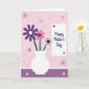 This card features a soft digital illustration in pale lavender, deep violet, and rose-pink, with crisp white highlights and leafy greens that feel gentle and affectionate ❤️. Near the lower middle sits a rounded white vase, simple and tidy, like it’s been set out with care for someone special. Three stylized flowers rise from it: a dark violet bloom with a white circular center, a coral-pink flower leaning close like a friendly companion, and a white flower with radiating petals and a deep violet stamen dotted with tiny marks. The slim green stems curve upward with a quiet closeness, as if the bouquet is sharing a private moment 🌼. Behind them, the lavender background includes faint diagonal lines and scattered small floral shapes in purple and white. In the upper right, a rounded white rectangle holds the words “Happy Mother’s Day” in dark blue lettering, with small purple dots around the panel. Along the bottom edge, a deep purple band stretches across with little white flower silhouettes spaced along it.