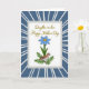 This card features a white rectangular panel centered on the front, edged with a pale gray border for a soft, tidy frame. Across the top of the panel, gold lettering reads “Daughter-in-law Happy Mother’s Day,” set in a flowing style that feels gentle and affectionate ❤️. Beneath the words, a spring scene appears with a stylized flower showing bright blue petals around a sunny yellow center. A small bird in warm brown and creamy tones rests nearby on feathery green leaves, angled as if leaning in close like a sweet, friendly companion. The flower’s green stem rises neatly from the lower portion of the panel, keeping the scene balanced and easy to take in. Surrounding the central panel is a rich blue background with thin white lines radiating outward, creating a sunburst effect that draws the eye inward 🌼. The overall palette blends cool blues and fresh greens with the warm gold text for a cozy, caring look. In the outer blue area, the white rays spread evenly from near the center toward the edges.
