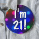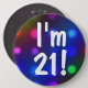 A festive colorful button pin with a background bokeh of colorful party lights and the text says: "I'm 21!" Easy to customize this cute badge and personalize with any age or name, etc. A happy and fun button pin for any age!