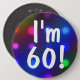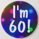 A festive colorful button pin with a background bokeh of colorful party lights and the text says: "I'm 60!" Easy to customize this cute badge and personalize with any age or name, etc. A happy and fun button pin for kids, teens, and men and women at sixty or any age!