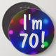 A festive colorful button pin with a background bokeh of colorful party lights and the text says: "I'm 70!" in contrasting white stylish text that stands out and is easy to read. Easy to customize this funny, cute badge and personalize with any age or name, etc. A happy and fun button pin for any age!