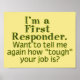 This reads, "I'm a First Responder. Want to tell me again how "tough" your job is?" For the people with the jobs that are really tough; the police, firefighters, rescue, and other emergency workers and volunteers.