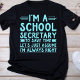 Introducing our "I'm A School Secretary To Save Time Let's Just Assume I'm Always Right" T-shirt – the perfect blend of wit and wisdom for the sharp-minded school secretary! This shirt playfully asserts the well-earned confidence and expertise that comes with managing the intricate details of school life. Whether you're organizing schedules, providing crucial information, or ensuring smooth operations behind the scenes, this shirt humorously encapsulates your knack for being on point. Ideal for casual wear or as a gift that celebrates the indispensable role of a school secretary, wear it proudly and let everyone know that in your domain, accuracy and efficiency go hand in hand!