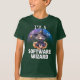 This image features a cartoon witch with a purple hat and a black dress, sitting on a pile of leaves and holding a broom. She has long, light blue hair and large, brown eyes. The background is a semi-transparent purple and blue gradient with a pattern of binary code. The text "I'M A SOFTWARE WIZARD" appears below the witch. The image suggests a playful and humorous take on the idea of a software developer as a magical figure. The binary code background further reinforces this connection to the digital world. The overall aesthetic is whimsical and fun, with a touch of whimsy.