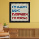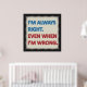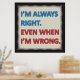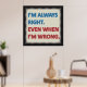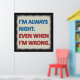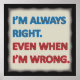 Poster featuring design with the text "I'm Always Right. Even When I'm Wrong" in blue and red.