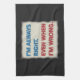 Black kitchen towel featuring design with the text "I'm Always Right. Even When I'm Wrong" in blue and red.