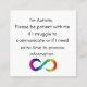This card is a simple yet effective way to communicate to others that you or a loved one is autistic and may need additional support or accommodations. The message is clear and easy to read, making it a great tool for autistic individuals to use in a variety of situations, from school or work to social events. It's a perfect way to raise awareness about autism and promote understanding and inclusivity.