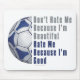 Futbal Art Don’t Hate Me Because I’m Good t-shirts, gifts, and accessories created by ITD Sports Center feature our original artwork of half a blue and white futbal ball on the left side with the words in gray and blue on the right, Don’t Hate Me Because I’m Beautiful, Hate Me Because I’m Good. Our fun and competitive sporting goods are great gifts for soccer lovers, fuybal lovers, soccer players, soccer stars, soccer coaches, athletes, and sports lovers of all ages. It’s all fun and games at Imagine That! Design Sports Center!