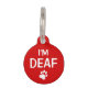 White and red tag for deaf pets featuring a white paw print silhouette. On one side it reads: "I'm deaf" and on the other side there are customizable text areas for the name of the pet and for a phone number.