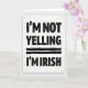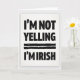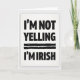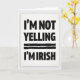 This card features a monochrome design that puts the funny phrase “I’M NOT YELLING I’M IRISH” right at the center in stacked, all-caps lettering 💚. The letters are deep black on a bright white background, with a worn, speckled texture that looks like tiny white flecks breaking up the ink. Two thick horizontal bars, matching the same rough texture, cut across the layout to frame the words and add extra punch. The overall look feels like a shared inside joke between friends, like you can almost hear someone saying it with a grin and a nudge ☘️. The text is arranged in a tight, centered column so your eyes move straight down the message without distraction. There are no characters or scenery, just strong type and contrast that keeps the focus on the humor. The black bars sit above and below parts of the stacked line, with the distressed edges clearly visible against the white space.