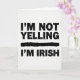 This card features a stark white background with the phrase “I’M NOT YELLING” set in large, all-caps black letters near the top, followed by a thick black horizontal bar that cuts across the middle like a divider. Beneath that line, “I’M IRISH” appears in the same heavy, all-caps black lettering, centered so the two lines face each other like a friendly back-and-forth. The letters and the divider carry a worn, distressed texture, with rough edges that make the message feel like it was stamped in a rush after a laughing toast with close friends 💚. With no characters or scenery, the design leans on contrast and spacing, letting the words land like a teasing remark shared between people who know each other well. The layout stays tightly centered, giving the statement a poster-like punch while still feeling casual and familiar. The only colors are black and white, which keeps every word easy to read and makes the texture stand out ☘️. A thick, solid black bar runs straight across the center, separating the top line from the bottom line.