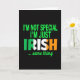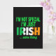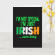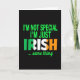This card features a sharp, high-contrast design on a deep black background, centered around the line “I’M NOT SPECIAL I’M JUST IRISH … same thing.” The top words “I’M NOT SPECIAL I’M JUST” sit in large uppercase letters, glowing in bright green 💚 and drawing your eye straight to the middle. “IRISH” is the focal point, with the left letters in green, a white section running through the center, and the right side in orange, echoing the Irish flag ☘️. The colors feel like a friendly wink between people who share an inside joke, with the green leading into the flag tones as if the line is being delivered with a grin. Beneath that, “… same thing” appears smaller and slightly slanted in matching green, starting with an ellipsis that makes it read like a casual follow-up. All the text is centered and evenly spaced, with the brightest glow around the green letters so they stand out most strongly. The final look is a black field with neon-like green type above and below, and the tricolor “IRISH” anchored in the middle.