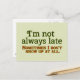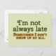 This reads, "I'm not always late. Sometimes I don't show up at all." For the serious procrastinators and those who oversleep a lot.