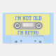 Stickers with slogan "I'm not old, I'm retro" on blue and green cassette tape.