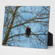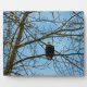 A photograph of a Bald Eagle perched in a tree, with a stern look, watching what is happening below the tree branches.