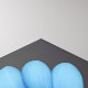 This image shows a close-up view of a vibrant blue flower with delicate, smooth petals arranged in a circular pattern. The flower has a bright, intense blue color with subtle lighter shades, creating a soft gradient. At the center, yellow and purple stamens stand out, adding contrast and drawing attention to the core. The flower's stem and leaves are green, appearing smooth and natural, with a slight curve. The background is a neutral dark gray, which makes the flower’s colors appear more vivid and striking.