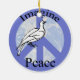 A white dove on a purple blue peace sign covers the planet earth. Imagine Peace.