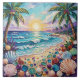 Pretty seaside coastal tile with a gorgeous ai impasto oil painting style illustration of blue ocean waves crashing on a sandy beach, that is covered in sea glass and surrounded by palm trees at sunset.