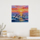 An ai impasto style dolphins swimming with a pink, orange and purple sunset over the ocean . A beautiful coastal poster wall art piece for your beach home or beachy styled home.