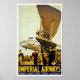Vintage air travel poster for defunct air travel pioneer Imperial Airways showing a large propeller driven biplane with passengers disembarking upon arrival.