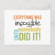 Multicolor text design reads "Everything Was Impossible Until Somebody Did It!" on inspirational T-shirts, buttons, cards, mugs, magnets, key chains, and other items great for teachers, coaches, parents, and anyone who inspires!