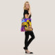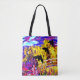 All over print ~ original collage and design by Aleta. Art on an earth conscious reusable tote. Bright, colorful image of a three crows or blackbirds taking flight, over a footbridge in a bright fanciful garden. Impressionistic homage to VanGogh, Monet and Manet. With perhaps a touch of Poe.