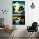 Painted landscape of a lake with clouds with tree and flowers, in the style of saturated color fields, expressive light and shadow, dark cyan and yellow.