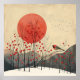 Beautiful impressionist painting of a Winter day. Bright orange Sun is setting in the background behind tall mountains. The land is covered with snow and a little bird sits in a tree with red impressionist accents.