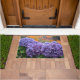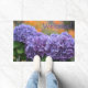 This beautiful and inviting welcome mat features an impressionistic rendition of purple hydrangea blossoms.